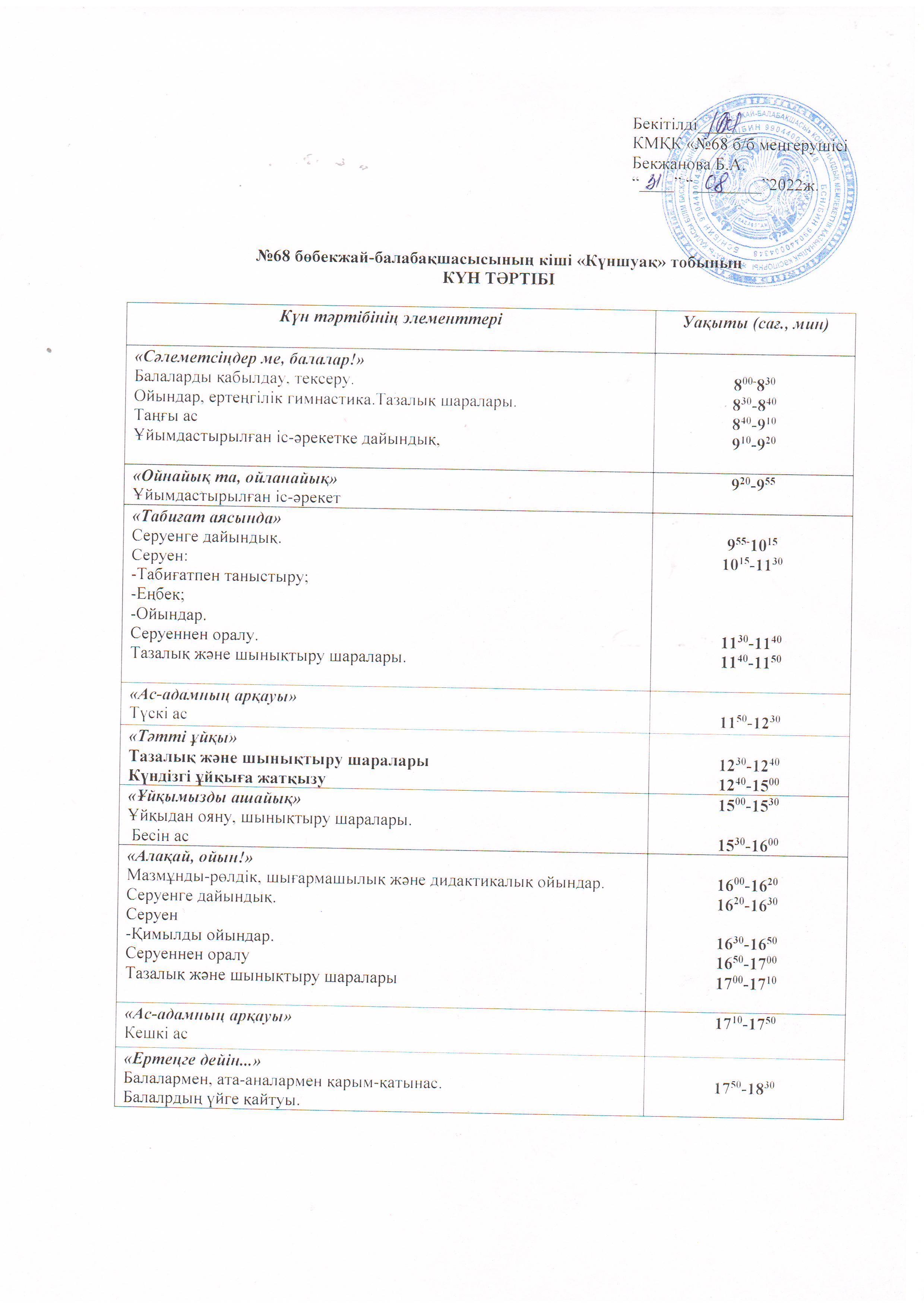 2022-2023 оқу жылына арналған Кіші "Күншуақ тобының" Күн тәртібі