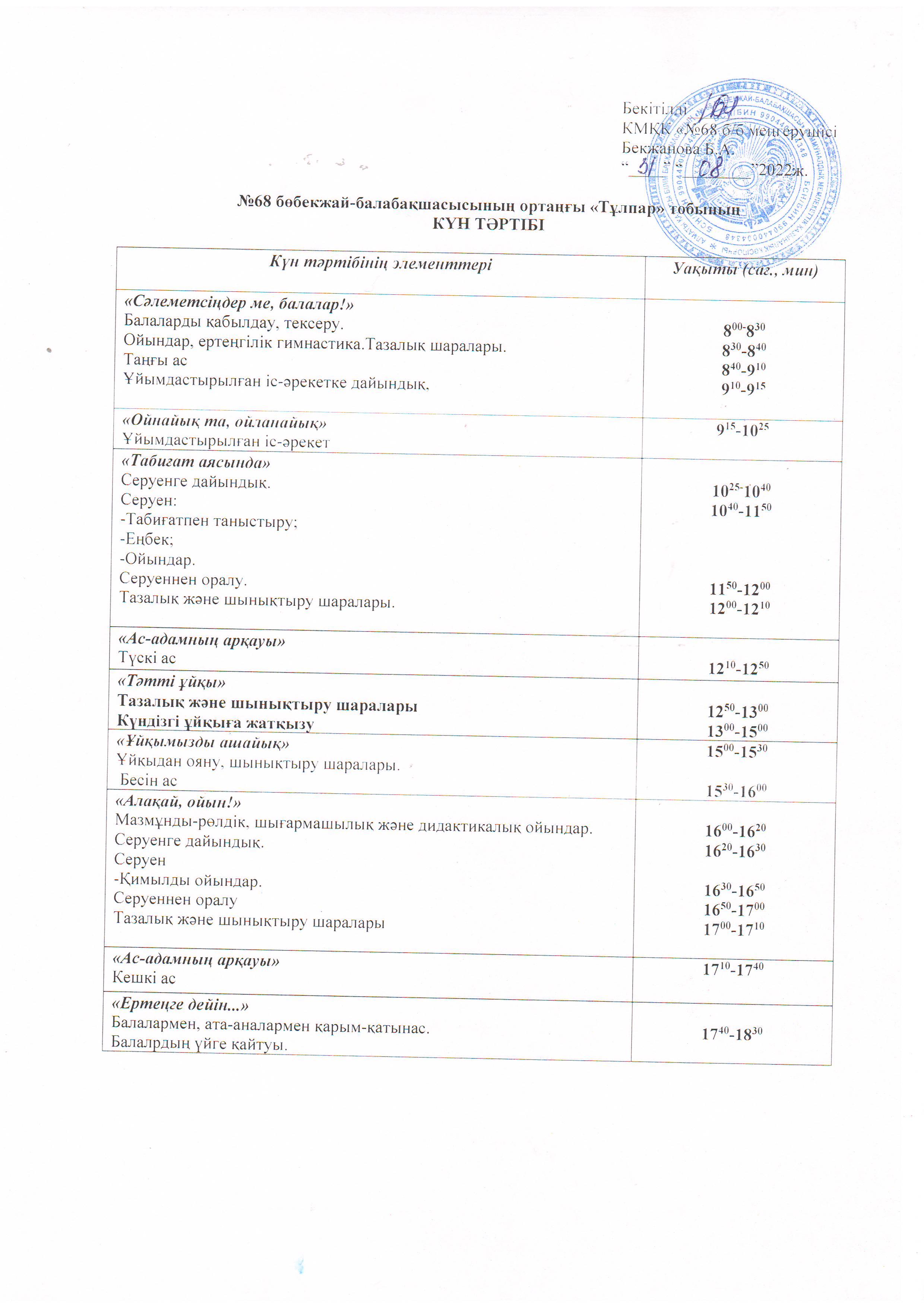 2022-2023 оқу жылына арналған ортаңғы "Тұлпар" тобының күн тәртібі