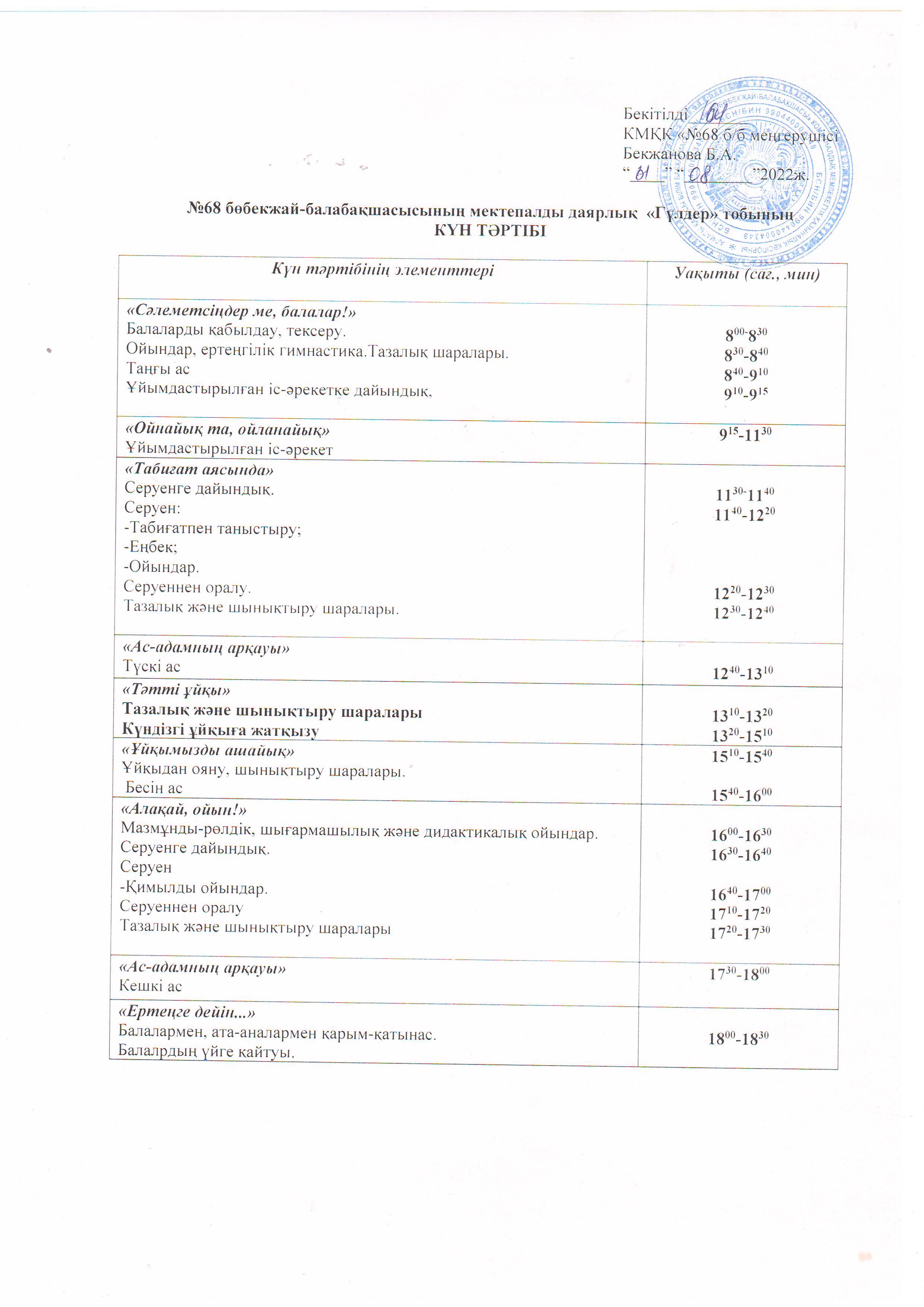 2022-2023 оқу жылына арналған ортаңғы "Маржан" тобының күн тәртібі